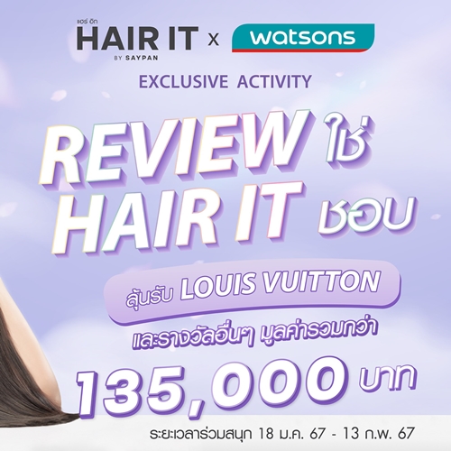 ลุ้นรับ LOUIS VUITTON และรางวัลอื่น ๆ แบบจัดเต็ม 44 รางวัล มูลค่ารวมกว่า 135,000 บาท วันที่ 18 มกราคม – 13 กุมภาพันธ์ 2567 เพื่อประชาสัมพันธ์สินค้าให้เป็นที่รู้จักมากยิ่งขึ้นและกระตุ้นยอดขายแบรนด์ HAIR IT