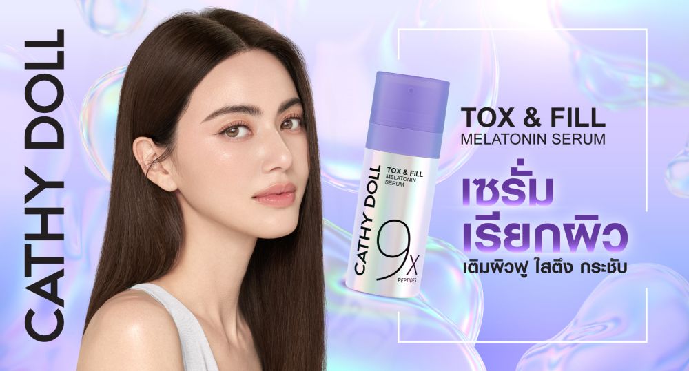 พรีเซ็นเตอร์ผลิตภัณฑ์ Cathy Doll Tox and Fill Melatonin Serum 9X Peptides, Cathy Doll Reju C Glass Skin Cream 0.2% PDRN, Cathy Doll White Bomb Serum in Cream 5% Niacinamide, Cathy Doll Melalight Anti Dark Spot Cream 1% Arbutin SPF15